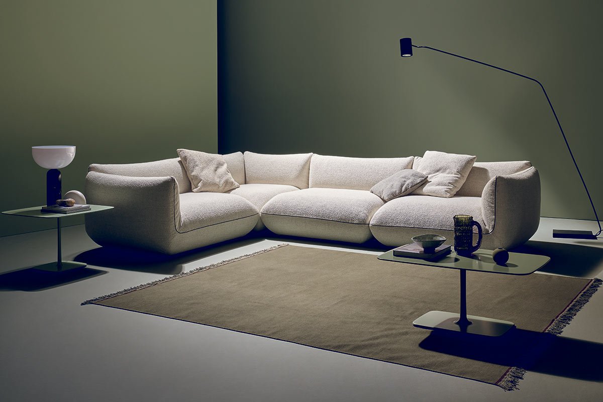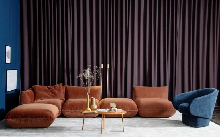 Moderne zitgroep / loungebank, bestaande uit zeven zitmodules met bijpassende rugleuningen (slechts zes weergegeven op de foto's).De modules zijn bekleed met een bruinachtige (eierplant) stof.Zeer goede staat met lichte gebruikssporen.Twee stoelen zijn 95 x 95 cm, vijf stoelen meten 95 x 65 cm.