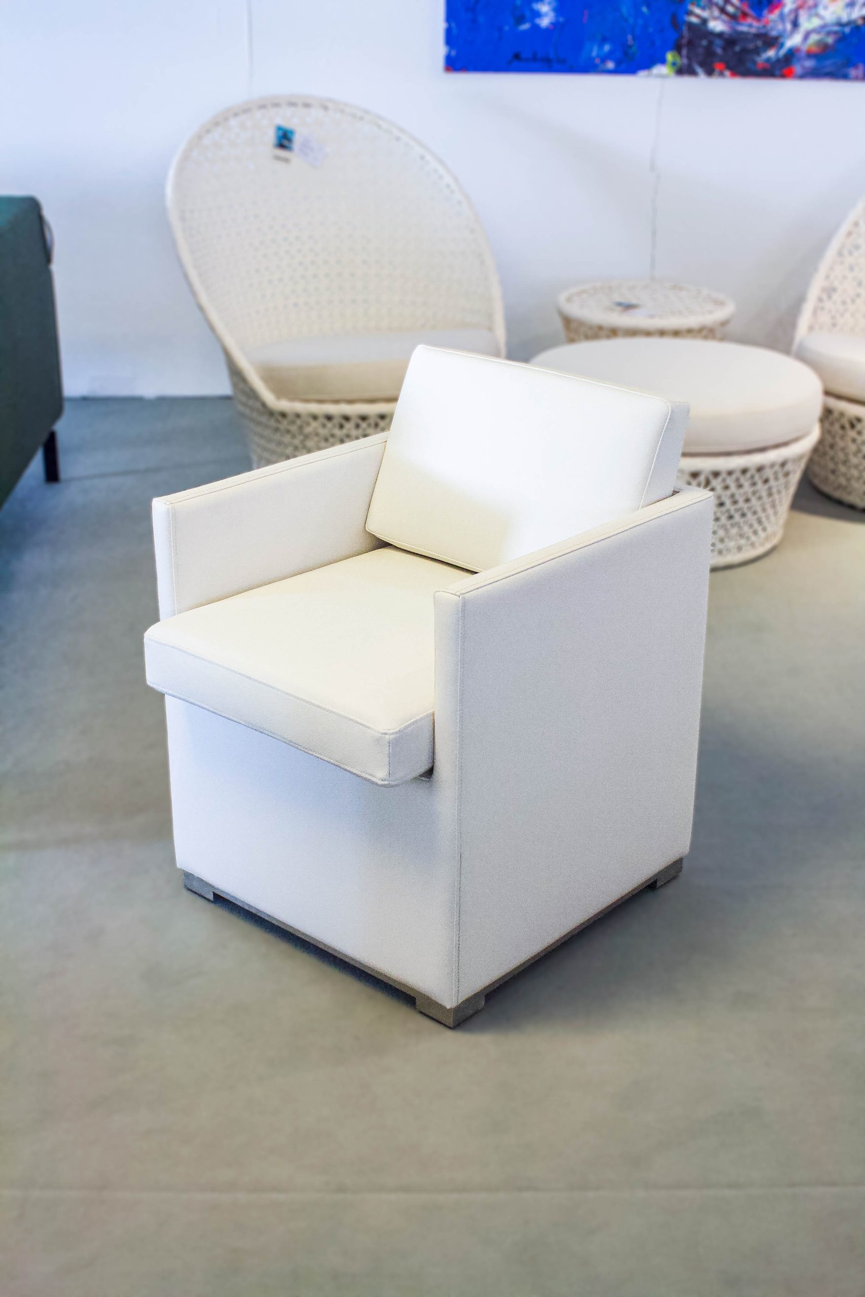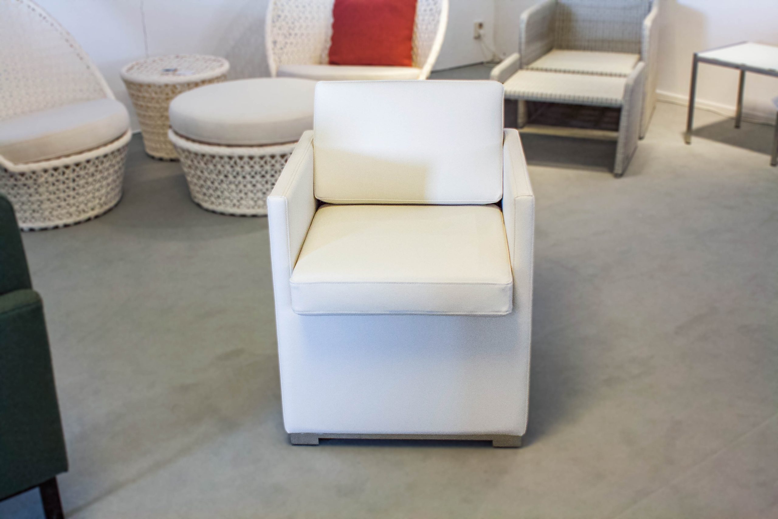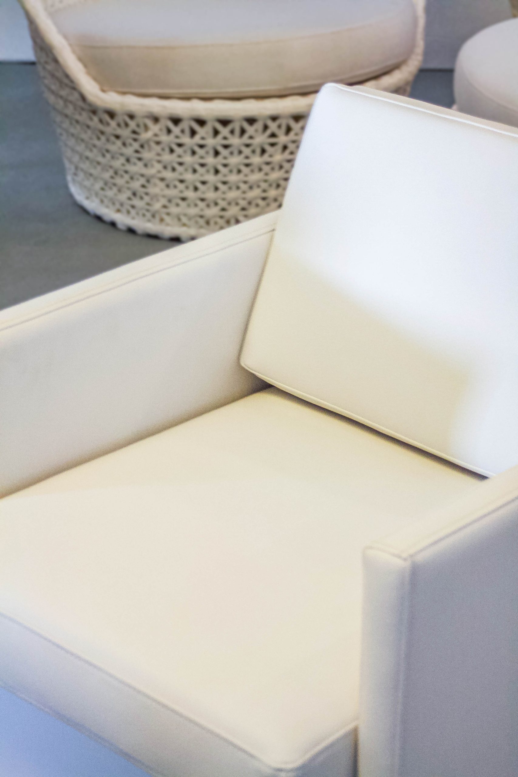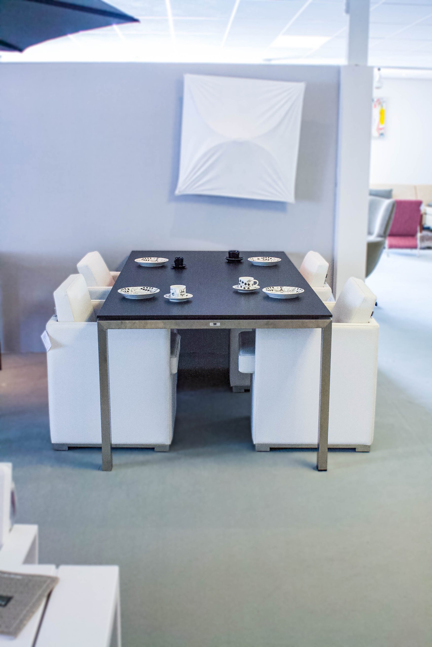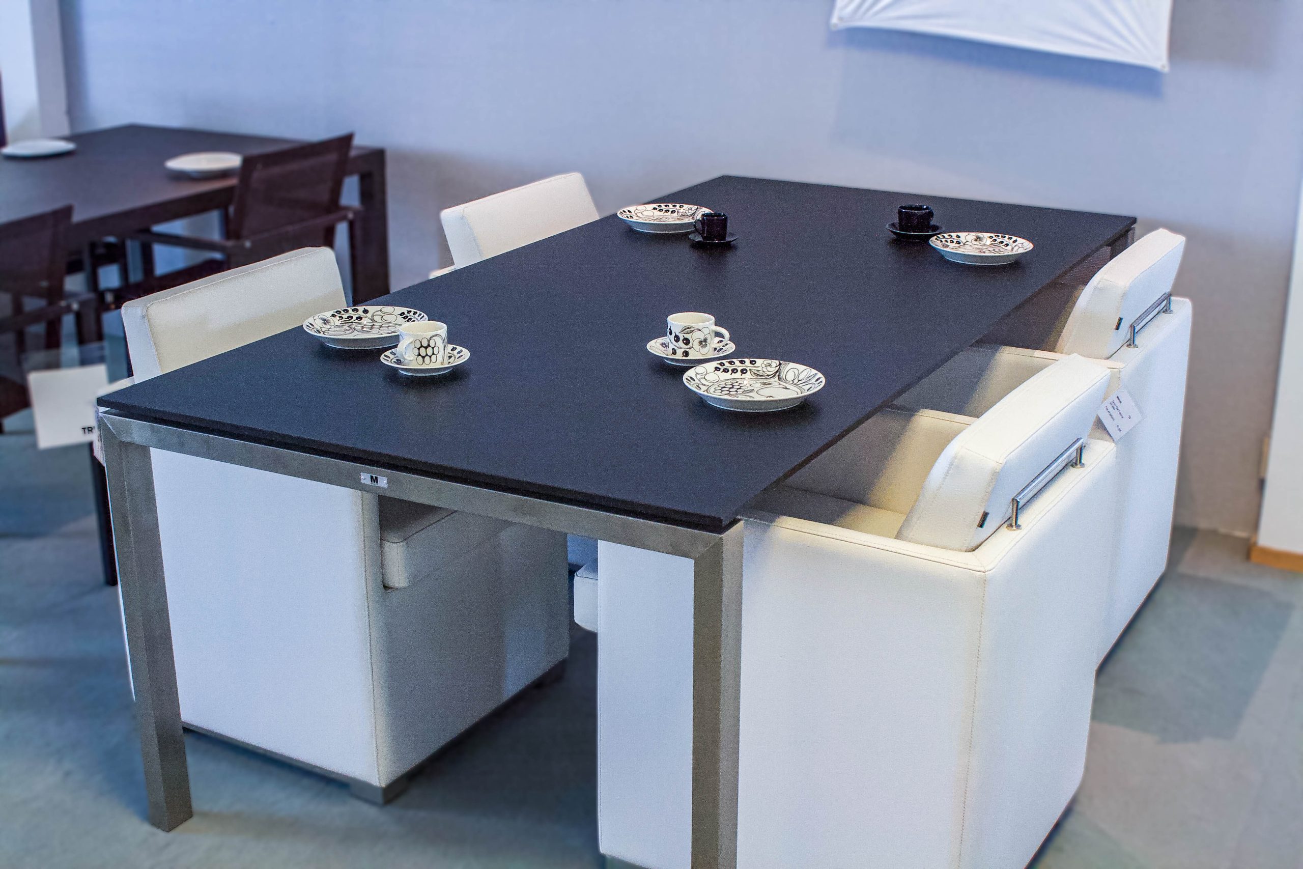 De Manutti set bestaande uit de Zendo stoel en de Trento eettafel Stoel: H 65,5 x B 60 x D 58 cm Tafel: H 75,5 x B 105 x D 220 cm Zwart + rvs en wit leer