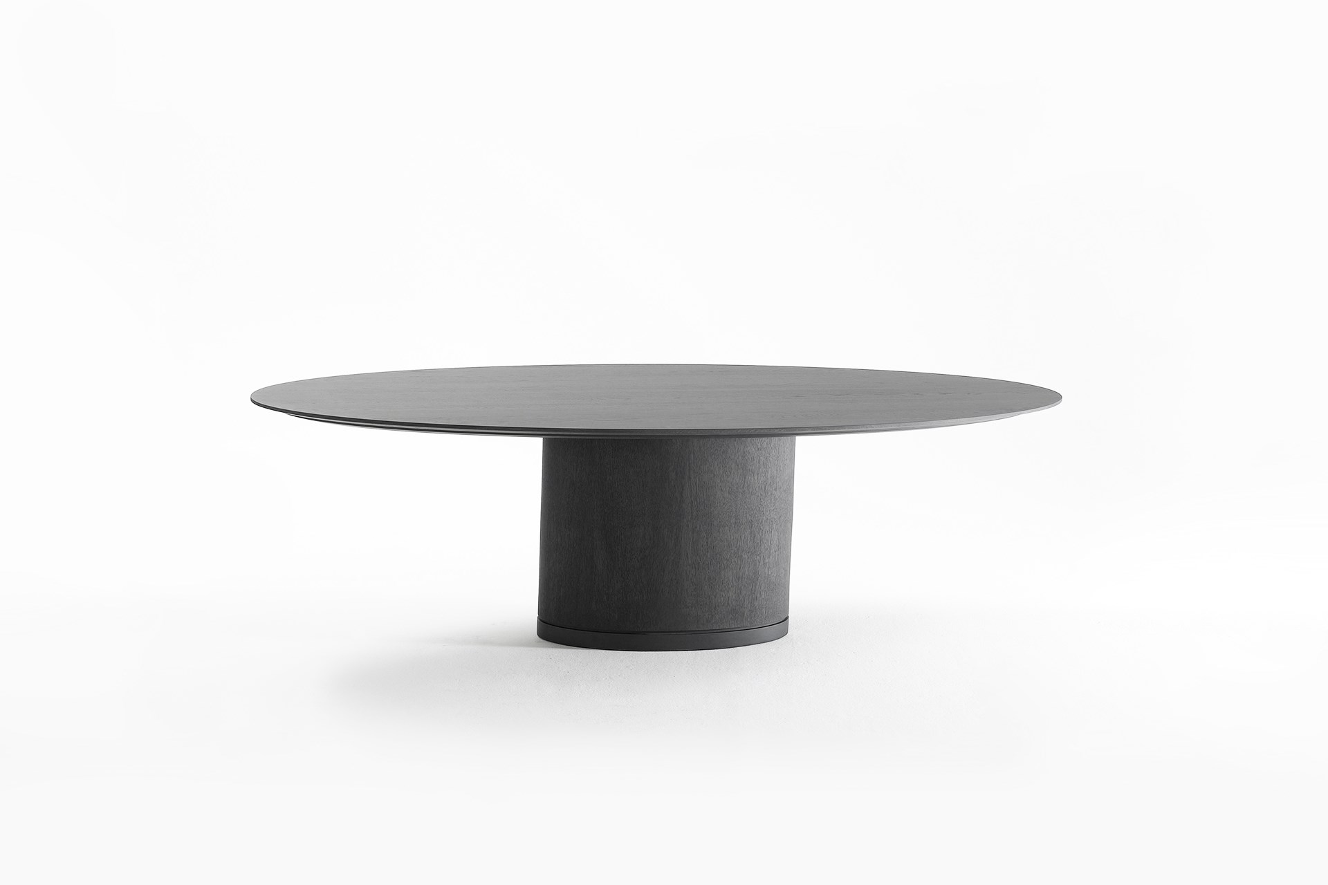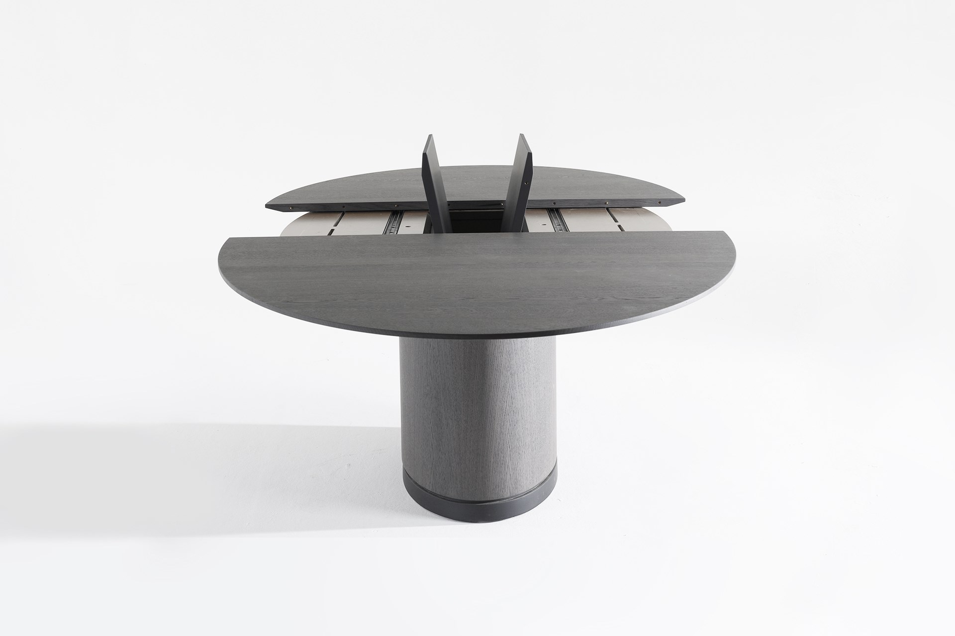 Het ronde, ellipsvormige of rechthoekige blad geeft deze robuuste kolomtafel een heel eigen elegantie. Het inlegblad van de vergrootbare Spazio tafel wordt in de kolom opgeborgen en komt via een gasdruksysteem omhoog.