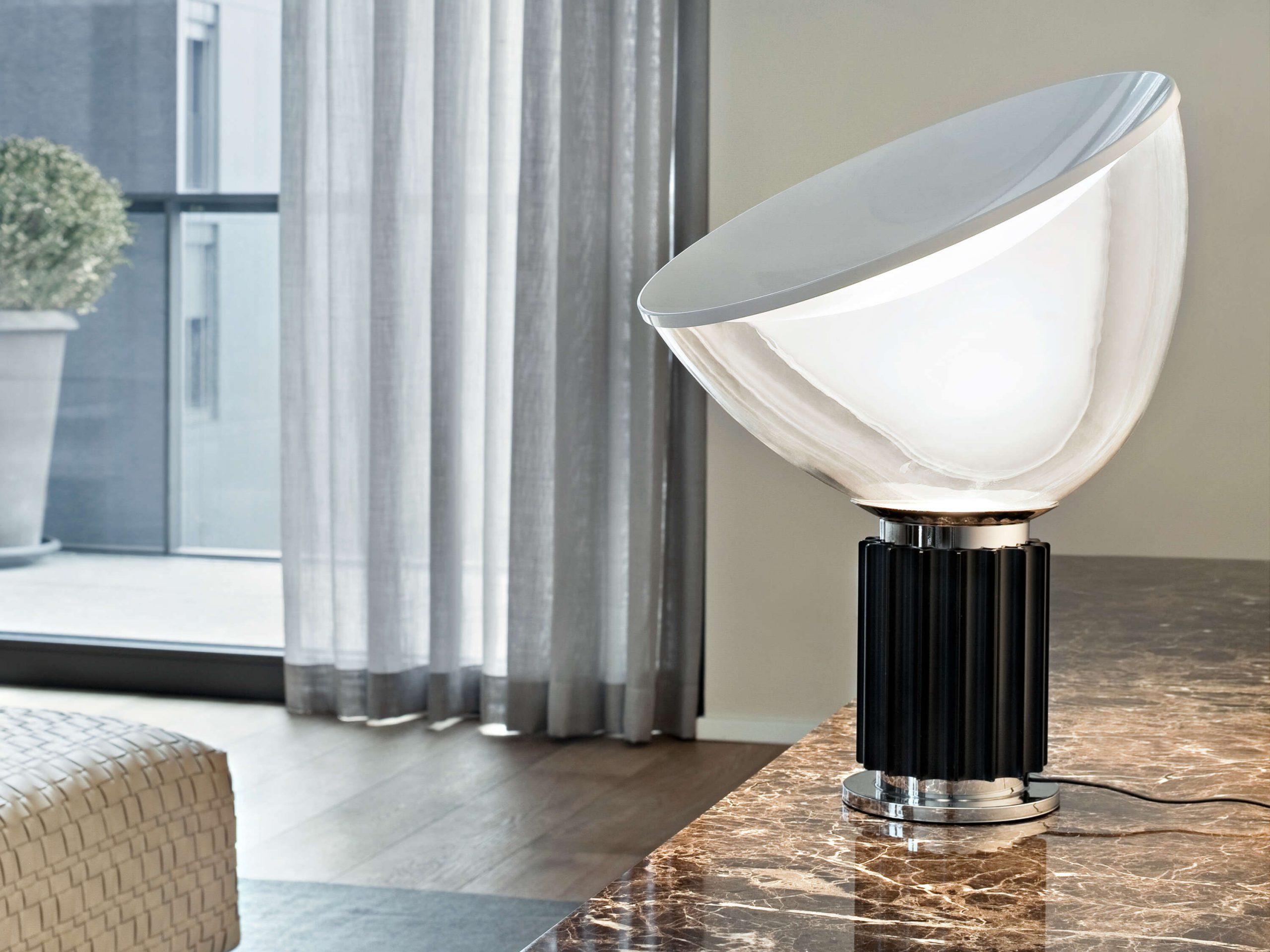 Tafellamp met indirect en gereflecteerd licht. Reflector in gelakt aluminium, glanzend wit aan de buitenkant en mat wit aan de binnenkant. Richtbare diffuser in transparant geblazen glas. Behuizing in mat zwart of natuurlijk geanodiseerd geëxtrudeerd aluminium. Basis in vernikkeld ABS+PC. Elektrische kabel van nuttige lengte 190 cm, met dimmer voor AAN/UIT en instelling van de lichtstroom tussen 10-100%. Stekkervoeding met verwisselbare stekkers.